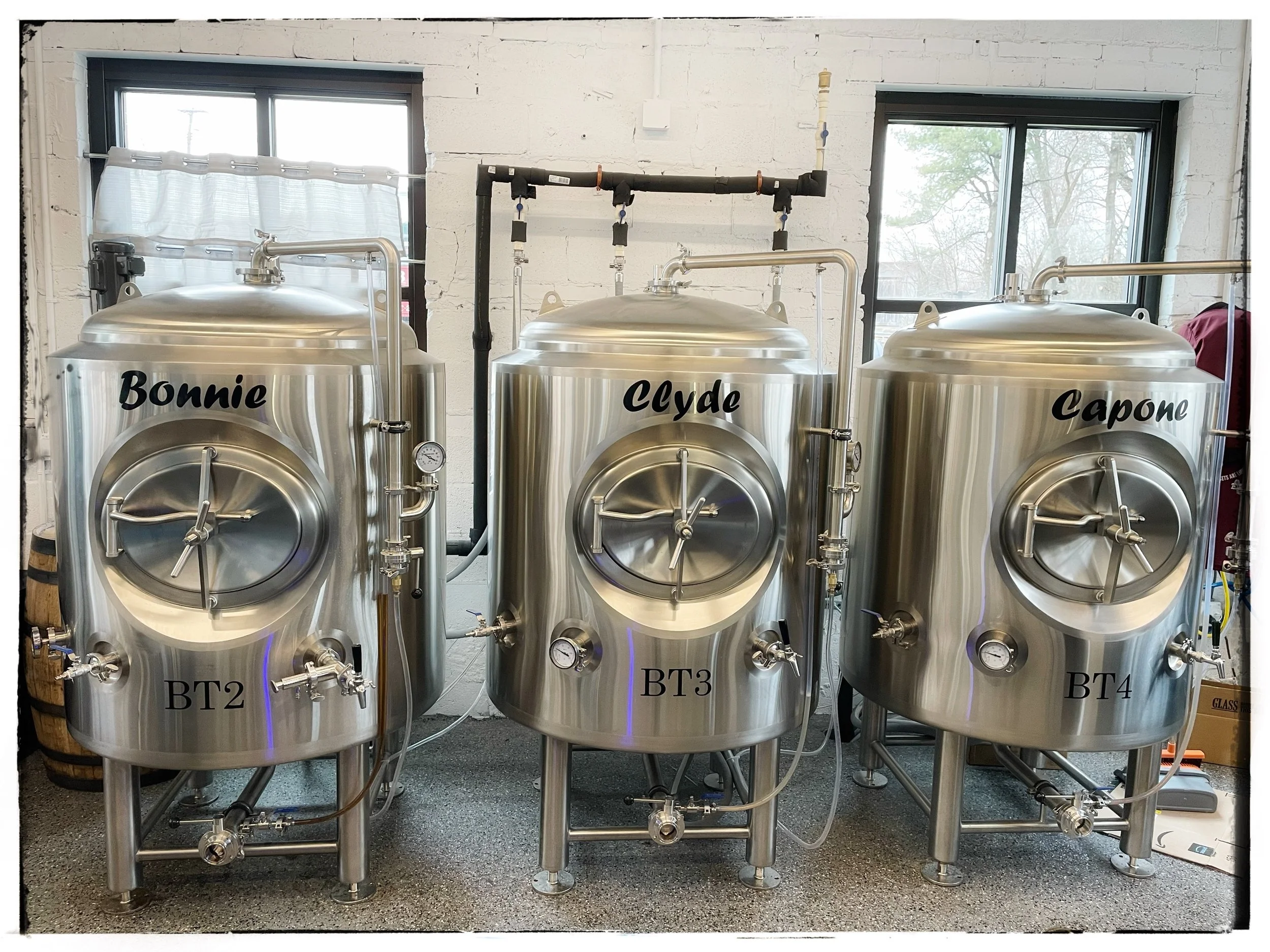 Dubbel Your Money has been a patron favorite. Many of the beers have a playful banking and finance reference such as First National Lager (lite lager), Foreign InFESTment Märzen, Liquid Exchange (hazy IPA), Bonus Day IPA, Death and Taxes (imperial milk stout). The list goes on. Even the brew vessels are dawned with names related to money, but from a different perspective — Bonnie, Clyde, Capone.