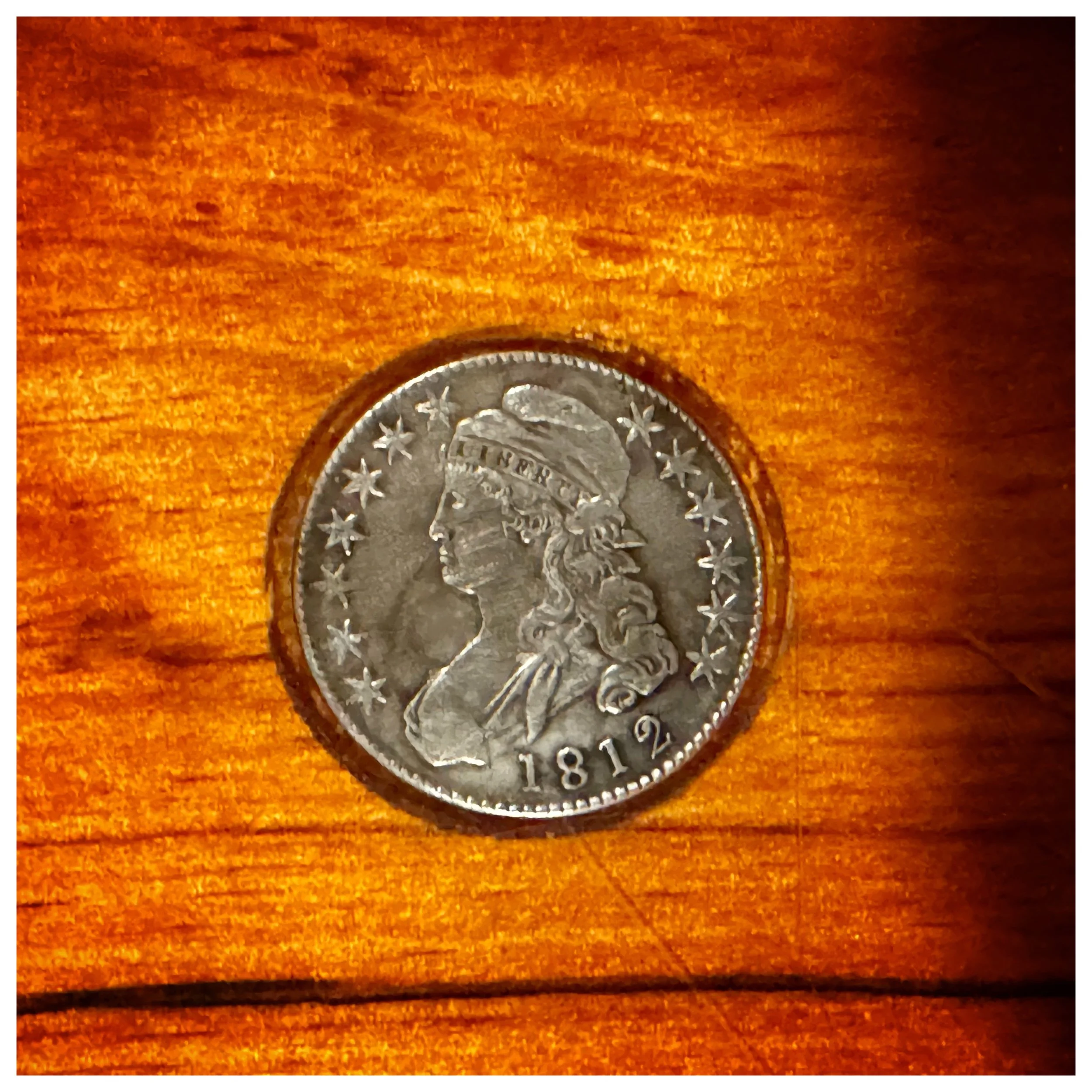 An 1812 coin embedded in taproom bar.